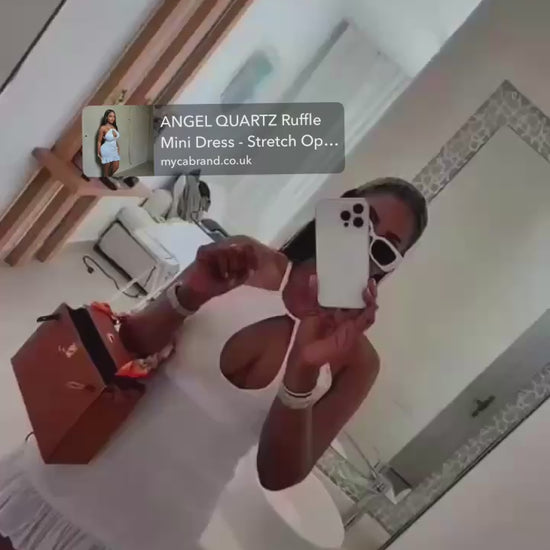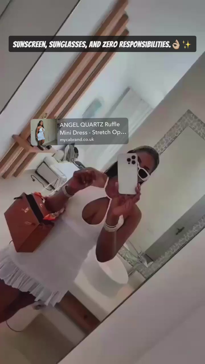 Featuring a keyhole halter neckline, adjustable wrap detail, and a flirty ruffle hem, this piece blends delicate design with MYCA’s signature body-flattering fit. The ANGEL shade—our cool, ethereal white—brings that fresh, glowing, goddess energy that photographs insanely well.